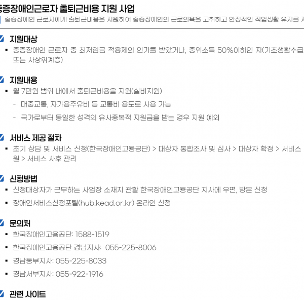 더보기 장애인 건강관리 교육 참가자 모집 3,147회 2026.02 여성장애인 건강관리 교실 참가자 모집 3,276회 2026.02 장애친화 건강검진기관 이용 행사 5,900회 2025.11 퇴원환자를 위한 건강관리 키트 지원 사업 경상남도에 거주지를 둔 등록 장애인을 대상으로지역장애인보건의료센터 건강정보시스템에 등록한 장애인에게 건강관리 키트를 지원하고 있습니다.  5,924회 2025.11 경상남도 지역장애인보건의료센터 홈페이지 오픈 더 나은 서비스로 지역 장애인들에게 가까이 다가오고, 소통하기 위해서 끊임없는 발전과 노력을 멈추지 않는 최고의 지역장애인보건의료센터가 될 것 5,897회 2025.10